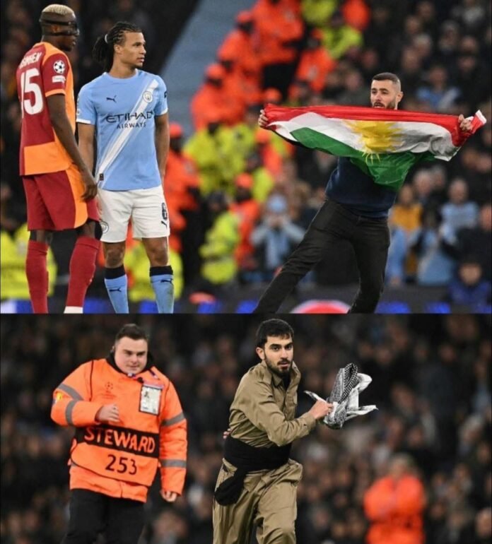 Three football fans entered the pitch during Manchester City’s match against Galatasaray. One fan wore traditional Kurdish clothing. Two others carried Kurdistan flags.