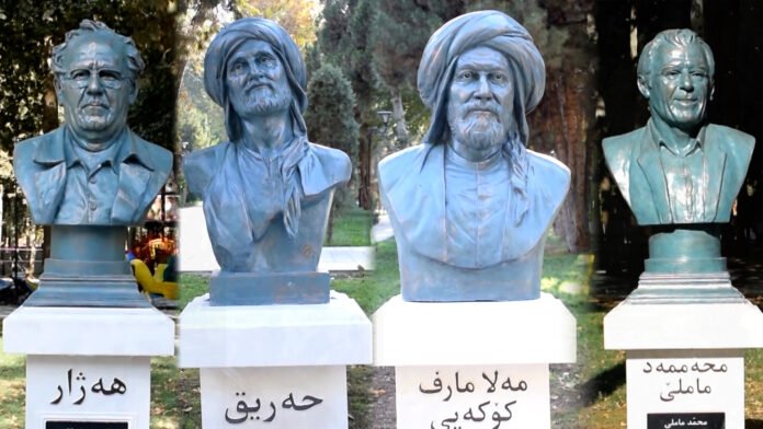 The statues stand near the park’s main entrance and the famous Red Bridge. Importantly, they honor the poets Hejar Mukriyani and Hemin Mukriyani alongside the musician Mohammad Mamle. Furthermore, the display includes statues of the poets Mela Saleh Heriq and Mela Marf Kokei.
